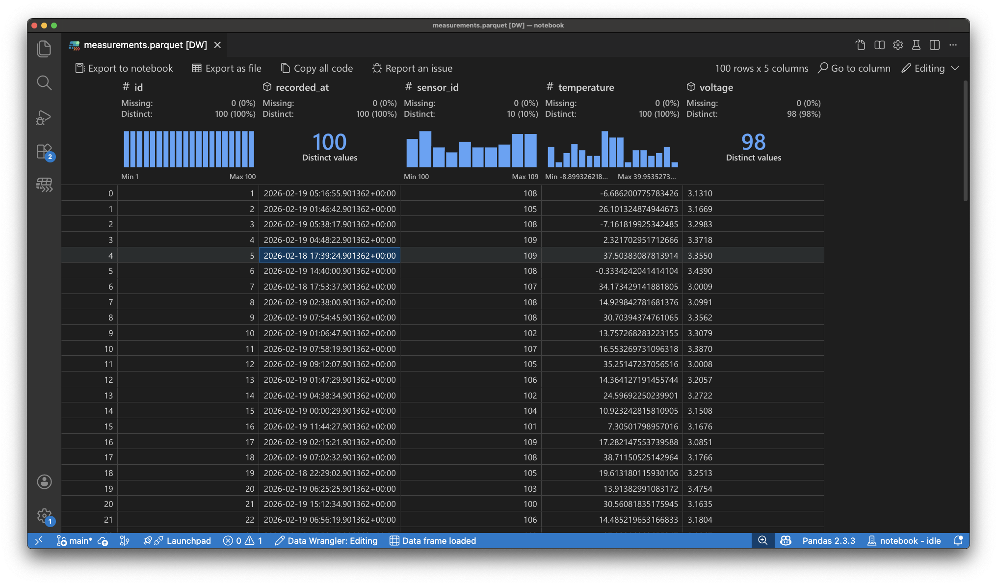 Suppose you have a sensor data pipeline. You want to archive today's rows to Parquet for downstream analytics.